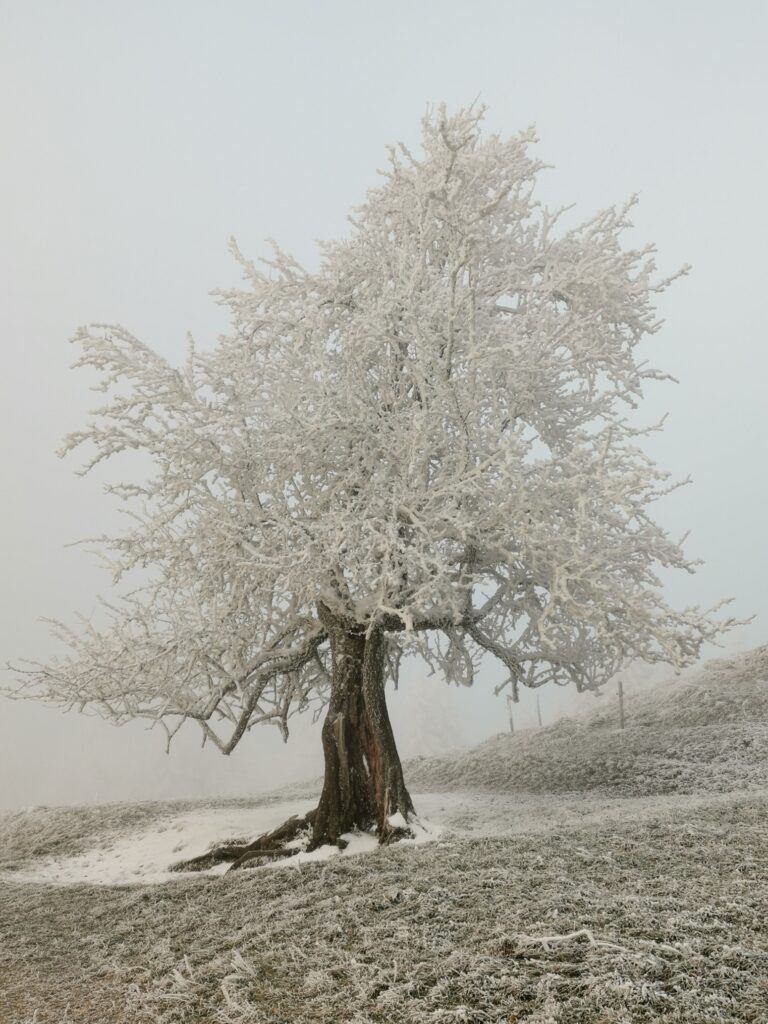 Jedoch hat auch der Nebel seine schönen Seiten und formt seine ganz eigene Kunst (Baum mit Eisnebel).