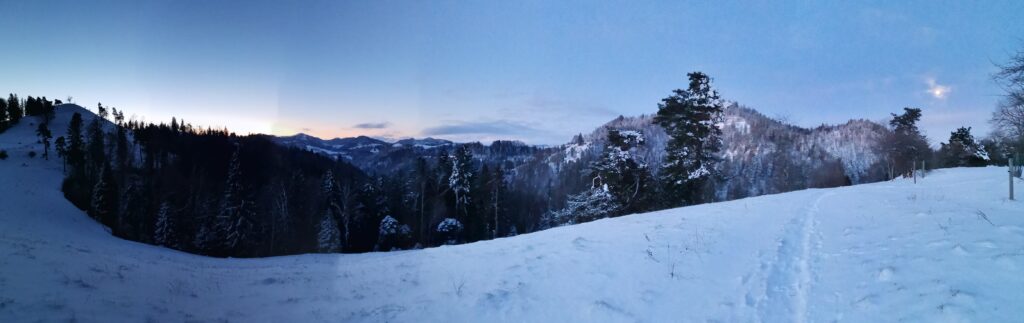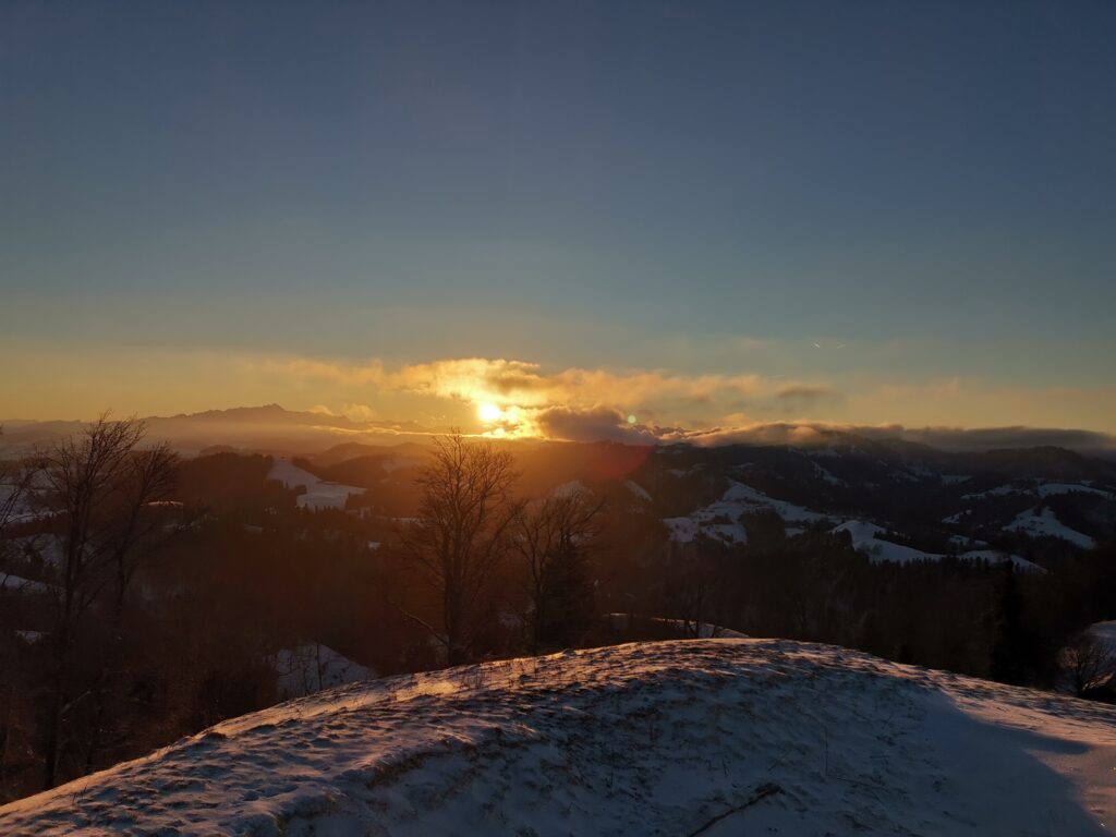 Diesen Winter, inspiriert von meinem Sohn, war ich mehrmals auf dem Hörnli um den Sonnenaufgang zu beobachten. Gestartet bin ich jeweils von der Hulftegg um ca. sieben Uhr. Um das Jahresende war der Sonnenaufgang gemäss Meteo um 08:10.